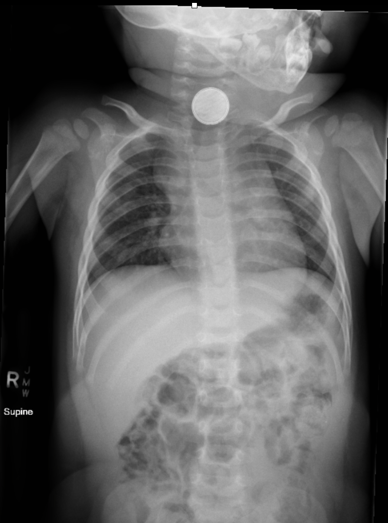 - Identity – while you can’t always spot the nature of a foreign body, there is a chance you may be able to pick out the halo sign that is characteristic of a button battery. It’s the shadow created by the structure of the thing itself (unlike the homogenous disc of a coin as a comparator).