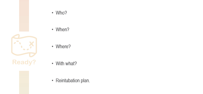 This should cover the ‘Other’ things you’re going to do with the extubation (something like an airway endoscopy, for example). The briefing should include a good chat about the ‘Go/No Go’ points – these are the elements defined by the team so everyone knows what they can look for to confirm the extubation should proceed. Of course the ‘No Go’ items are signs that today is not the day.